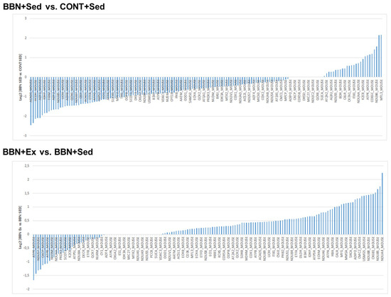 Normalized abundance of proteins in BBN+Sed vs. CONT+Sed and BBN+Ex vs. BBN+Sed groups. Proteins with log2 lower than 0.05 are not presented in the figure but are listed in Supplementary Table S1. Protein accession numbers are correlated to protein names in Supplementary Table S1.