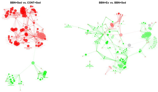 ClueGo + CluePedia analysis of protein-protein interaction considering unique proteins and the ones present in significantly distinct levels (based on emPAI values) in the heart of CONT+Sed and BBN+Sed, and BBN+Sed and BBN+Ex animals. In BBN+Sed vs. CONT+Sed analysis, green nodes refer to the biological processes up-regulated in the BBN+Sed group and red nodes refer to the ones up-regulated in the CONT+Sed group. In BBN+Ex vs. BBN+Sed analysis, green nodes refer to the biological processes up-regulated in BBN+Ex and red nodes refer to the ones up-regulated in BBN+Sed. Node size and color intensity reflect the number of associated proteins.