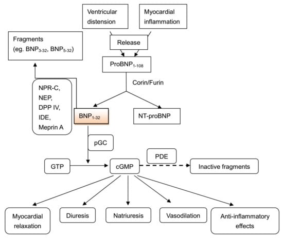 BNP is degraded through two well-characterised processes: (1) NPR-C-mediated internalization followed by lysosomal degradation; and (2) enzymatic degradation. It has been reported that the active form of BNP (BNP1–32) can be degraded by dipeptidyl peptidase IV (DPP IV), NEP, meprin and insulin degrading enzyme (IDE) to form BNP3–32, BNP5–32, BNP8–32 and smaller degradation peptides [43,44,45]. This cascade of events culminating in BNP release and associated vasodilatation is summarised in Figure 2.