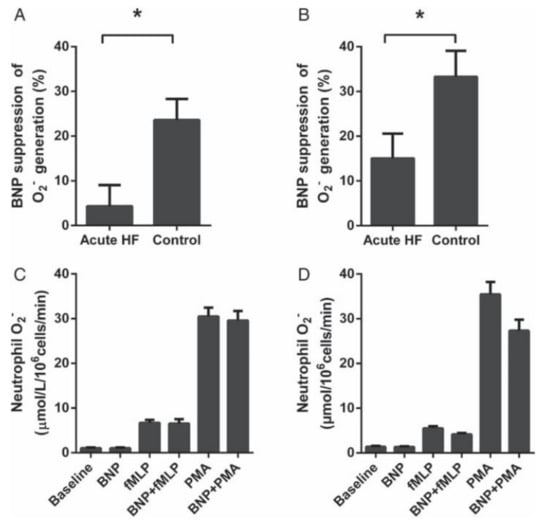 Comparison of BNP effects on phorbol 12-myristate 13-acetate (PMA)-stimulated (A) and N-formyl-methionyl-leucyl-phenylalanine (fMLP)-stimulated (B) O2− generation by neutrophils from acute heart failure patients (n = 45) and control subjects (n = 29). (C,D) Raw data for actual O2− production in neutrophils from acute heart failure patients (C) and control subjects (D). * p < 0.05 [14].