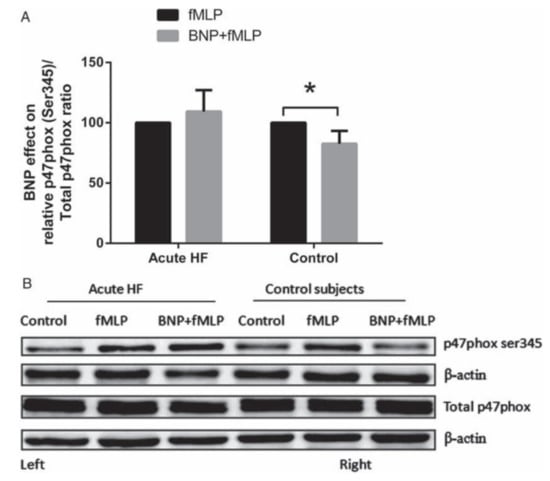 Subsequently, we sought to evaluate whether this “protective” effect of BNP might vary under conditions of acute myocardial inflammation, which particularly occur in patients with heart failure of recent onset. We compared the impact of exogenous BNP on the “neutrophil burst” in healthy subjects and in patients with acute heart failure. In the latter group, the impact of BNP in suppressing O2− release was substantially diminished (Figure 3), and in association with this, it was found [14,48] that BNP inhibited phosphorylation of the NADPH oxidase subunit p47phox (and consequent activation of NADPH oxidase) only in normal subjects (Figure 4). These observations therefore implied that acute heart failure is associated with impairment of the anti-oxidant effects of BNP at the neutrophil level, leading to net increases in the formation of O2− and its potential extracellular release, and thus rendering patients more prone to tissue injury. Interestingly, this “BNP resistance” partially resolved over a mean period of five weeks of anti-failure therapy. Furthermore, while we did not explore whether greater infiltration of myocardium with leukocytes in heart failure might reflect poor tissue responsiveness to BNP, this has been suggested by previous investigations by Kawakami et al. [49].