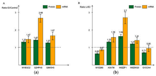 3.9. Correlation between mRNA and Protein Levels by Quantitative Real-Time Polymerase Chain Reaction (qRT-PCR)