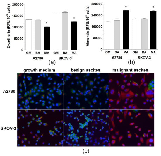 Expression of E-cadherin (a) and vimentin (b) in A2780 and SKOV-3 cells exposed to growth medium (GM), benign ascites (BA), and malignant ascites (MA). Panel (c) shows representative results of the dual immunostaining of E-cadherin (green) and vimentin (red) in the cancer cells. DAPI staining (blue) indicates the nuclei (magnification ×100). Asterisks (*) indicate significant differences (p < 0.05) compared with ovarian cancer cells exposed to benign ascites. Experiments were performed with the cancer cells used in hexaplicates. The benign and the malignant ascites were obtained from eight different patients per group. RFU—relative fluorescence units.