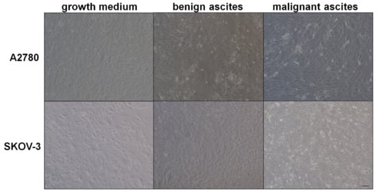 Malignant ascites were obtained at the time of cytoreductive surgery from chemotherapy-naïve patients with high-grade serous ovarian cancer (n = 8, 42–68 years of age). Benign fluids were collected from 8 patients (40–62 years of age) undergoing surgery due to the presence of cystadenoma mucinosum multiloculare, which is a benign cystic ovarian tumor. For experimental purposes, only 50 mL of both types of ascites were collected and processed. Upon collection, the fluids were centrifuged at 2500 rpm for 5 min, and then cell-free supernatants were stored at −20 °C. The malignant and benign ascites were assessed separately (not pooled) for the assays.