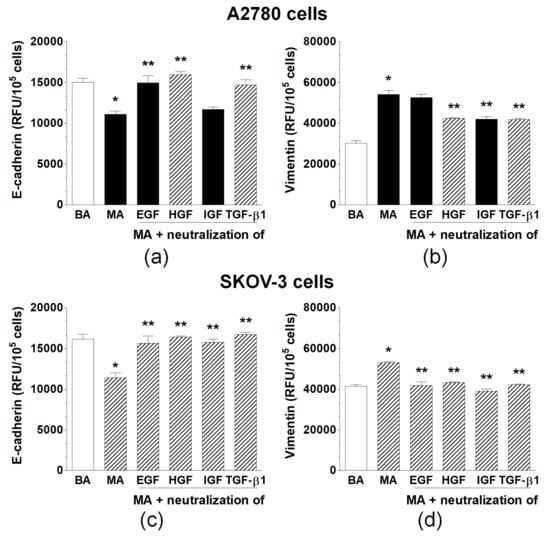 Expression of E-cadherin and vimentin in A2780 (a,b) and SKOV-3 cells (c,d) exposed to benign ascites (BA), malignant ascites (MA), and MA pre-incubated with specific antibodies against EGF, HGF, IGF, and TGF-β1. Hatched bars indicate the mediators whose neutralization consistently reversed the MA-dependent changes in the level of E-cadherin or vimentin. Single asterisks (*) indicate significant differences (p < 0.05) compared with ovarian cancer cells exposed to benign ascites. Double asterisks (**) indicate significant differences (p < 0.05) compared with the cells exposed to MA. Experiments were performed with the cancer cells used in hexaplicates. The benign and malignant ascites were obtained from eight different patients per group. RFU—relative fluorescence units.