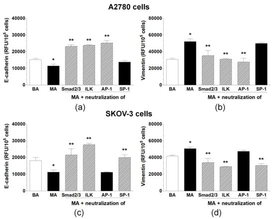 Expression of E-cadherin and vimentin in A2780 (a,b) and SKOV-3 cells (c,d) exposed to benign ascites (BA), malignant ascites (MA), and MA following cancer cell pre-incubation with the inhibitors of Smad 2/3, ILK, AP-1, and SP-1. Hatched bars indicate these signaling molecules whose blockade consistently reversed the MA-dependent changes in either the E-cadherin or vimentin level. Single asterisks (*) indicate significant differences (p < 0.05) compared with ovarian cancer cells exposed to benign ascites. Double asterisks (**) indicate significant differences (p < 0.05) compared with the cells exposed to MA. Experiments were performed with the cancer cells used in hexaplicates. The benign and malignant ascites were obtained from eight different patients per group. RFU—relative fluorescence units.