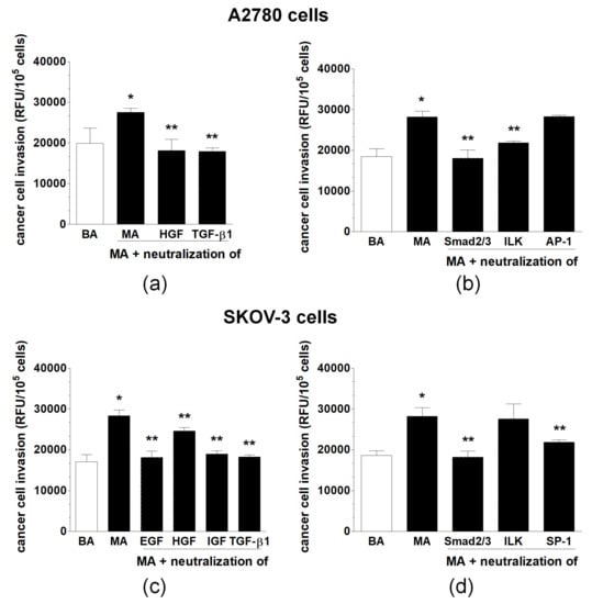 Invasion of A2780 and SKOV-3 cells through monolayered peritoneal mesothelial cells upon preincubation of malignant ascites (serving as the chemoattractant) with the antibodies neutralizing possible mediators of EMT (a,c) and following preincubation of the cancer cells with the inhibitors neutralizing EMT-associated signaling molecules (b,d). Single asterisks (*) indicate significant differences (p < 0.05) compared with ovarian cancer cells exposed to benign ascites. Double asterisks (**) indicate significant differences (p < 0.05) compared with the cells exposed to MA. Experiments were performed with cancer cells used in hexaplicates. The benign and malignant ascites were obtained from eight different patients per group. RFU—relative fluorescence units.