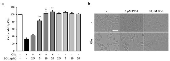 In this study, we used HT22 cells, the immortalized mouse hippocampal cell line. The HT22 cells were cultured in complete growth medium; Dulbecco’s modified Eagle’s medium (DMEM) (Corning, Manassas, VA, USA) supplemented with 10% fetal bovine serum (Atlas, Fort Collins, CO, USA) and antibiotics (penicillin/streptomycin; Gibco, Grand Island, NY, USA). The cells were maintained at 37 °C in a humidified incubator supplied with 5% CO2. For the experiments, the cells were plated onto multi-well plates at a density of 2.5 × 10 cells/cm2 and incubated for 24 h to adhere before treatment. The cells were then exposed to 5 mM glutamate (Sigma-Aldrich; St. Louis, MO, USA) in the presence or absence of PC-1 for the indicated time.