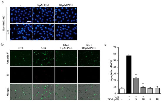 Glutamate induces neuronal cell death via both necrotic and apoptotic pathways. Previously, in HT22 cells, glutamate was found to induce necrosis relatively quickly, whereas the majority of cells were apoptotic at later stages [,]. In this study, we focused on preventing glutamate-induced apoptosis in HT22 cells. To evaluate the preventive effect of PC-1 against glutamate-induced apoptosis, we first examined chromatin condensation, a key characteristic of apoptotic cell death. Our results indicated that treatment with glutamate increased chromatin condensation in HT22 cells, while PC-1 levels markedly diminished (Figure 3a). We further performed an image-based cytometric analysis to quantify the proportion of apoptotic cells in each group. The HT22 cells were exposed to 5 mM glutamate in the presence or absence of PC-1 for 12 h and labeled with Alexa Fluor 488-conjugated annexin V and propidium iodide (PI). The resulting percentage of annexin V-positive apoptotic cells was 57.4% after treatment with glutamate, while PC-1 significantly reduced the percentage of apoptotic cells to 23.5 and 9.31% after treatment with 5 and 10 μM PC-1, respectively (Figure 3b,c). Representative images indicate that the majority of cells treated with glutamate were annexin V-positive (apoptotic) cells, which were reduced by PC-1, and only a few PI-positive cells were detected (Figure 3c). These results suggest that the protective effect of PC-1 against glutamate-induced HT22 cell death is due to its anti-apoptotic properties.