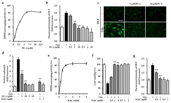 Glutamate-mediated oxidative stress triggers neuronal death in culture systems, such as primary neuronal cell cultures and cell lines []. It has been reported that flavonoids and ellagitannins with strong antioxidant activity prevent glutamate-induced neuronal death []. These results indicate that preventing the accumulation of intracellular ROS is a possible strategy for protecting neurons against glutamate-induced cell death. Therefore, we initially tested the antioxidant activities of PC-1 using a 2,2-diphenyl-1-picrylhydrazyl (DPPH) radical-scavenging activity assay. The result showed that PC-1 exhibited strong antioxidant properties, as indicated by DPPH radical scavenging activity (Figure 4a). This suggests that the antioxidant properties of PC-1 can reduce the accumulation of intracellular ROS. We further tested whether PC-1 prevents the glutamate-induced accumulation of intracellular ROS. As shown in Figure 4b, fluorescent images showed that treatment with glutamate triggers increased intracellular ROS levels while PC-1 almost completely blocked this increase (Figure 4b). Consistent with this result, our quantitative results showed that glutamate treatment increased intracellular ROS level (1.99-fold increase) was significantly reduced by 5 and 10 μM PC-1 (1.23- and 0.91-fold increases, respectively) (Figure 4c). Excessive ROS can modify lipids, nucleic acid, and proteins []. Protein carbonylation is an attractive marker of oxidative stress and associated with various disease including chronic renal failure, Alzheimer’s disease, and ischemic reperfusion injury []. Therefore, we carried out protein oxidation assay to access antioxidant activity of PC-1 against oxidative stress induced by glutamate. Our results showed that PC-1 as well as N-acetyl-cysteine (NAC), known as a strong antioxidant, significantly reduced protein carbonylation by glutamate-triggered oxidative stress (Figure 4d). As a positive control, the treatment with NAC also showed a strong DPPH scavenging activity and preventive effect of glutamate-induced HT22 cell death (Figure 4e,f). N-acetyl-cysteine also blocked the accumulation of intracellular ROS induced by glutamate (Figure 4g). These results suggest that PC-1 prevents glutamate-induced oxidative stress through its antioxidant properties.