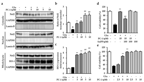 Therefore, we examined the effects of PC-1 on the translocation Nrf2 and the expression of HO-1 in HT22 cells. After exposure to 5 mM glutamate in the presence or absence of 5 or 10 μM PC-1 for 6 h, we prepared whole lysate, cytosolic, and nuclear fractions to evaluate the nuclear translocation of Nrf2 and the expression of HO-1. Our results showed that treatment with glutamate significantly decreased the nuclear translocation of Nrf2 compared with the control group. However, nuclear Nrf2 increased significantly by PC-1 treated with or without glutamate in HT22 cells (Figure 5a,b). We also confirmed whether there is any change in the expression of Nrf2 protein. The results indicated that the expression of Nrf2 protein was not changed in all experimental groups (Figure 5a). In addition to this, our results showed that HO-1 expression significantly increased as a result of treatment with PC-1 in the presence or absence of glutamate, whereas treatment of glutamate alone did not affect expression of HO-1 (Figure 5a,c). These results suggest that Nrf2-mediated HO-1 expression might be a possible molecular mechanism for eliminating glutamate-induced oxidative stress by PC-1 in HT22 cells.