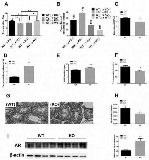 miR-125b-2 knockout causes different reproduction phenotypes. (A,B) The effect of miR-125b-2 knockout on the fertility of male mice. WT and KO males were examined in the following four combinations: WT♀ × KO♂, KO♀ × KO♂, WT♂ × KO♀, and WT♀ × WT♂. The pups (A) and litter rate (B) were counted (n = 15–20). (C,D) Effect of miR125b-2 on sperm count (C) and percentage of abnormal sperms (D) (n = 8). T (testosterone) concentration (E) and E2 (estradiol) concentration (F) in nine-week-old WT and KO mice (n = 8). (G) Microscopic observations of seminiferous tubules in WT and KO mouse testes: a—wild-type FVB/NJ (FVB) male with normal spermatogenesis; b—KO FVB/NJ male (recipient strain). (H) P450 expression in mouse testis in KO mice (n = 8). (I) Characterization of androgen receptor (AR) protein and gray-scale scanning analyses in WT and KO mouse testis (n = 4). All of the data were expressed as mean ± SEM. * p < 0.05, ** p < 0.01.