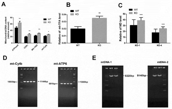 Interestingly, we also found that the DEGs of the WT and KO participated in the mitochondrial metabolism biological processes. The increase in the mitochondria DNA (mtDNA) copy number is also reported to decrease sperm quality. To determine the effect of miR-125b-2 on the mtDNA copy number in mouse sperm, we compared WT with KO mice. We detected the relative expression level of four marker genes’ mRNA, which stood for the mtDNA copy number, including ATPase6, COX2, Mit-1000, and mt-Cytb. The relative expression of mRNA was normalized by the detection of nuclear DNA. Compared with the WT group, the relative expression of ATPase6, COX2, Mit-1000 and mt-Cytb mRNA increased significantly in the KO group, with p = 0.01, p = 0.009, p = 0.004, p = 0.031, respectively (Figure 3A). The mtDNA copy number depends on the expression level of mt-TFA []. So, we next detected the mRNA level of mt-TFA. As expected, the mRNA level of mt-TFA increased significantly (p = 0.009) (Figure 3B). For the changes in the expression of the mitochondrial NADH dehydrogenase, we examined the mRNA level of ND1 and ND4 in the sperm. The results showed that the ND1 and ND4 increased significantly in the sperm of the KO mice (p = 0.007, p = 0.002). Consistent with the four marker genes’ results, as expected, the mRNA of the mt-TFA, ND1, and ND4 level increased significantly in the KO group (Figure 3C). To investigate both the mtDNA integrity and the mutations of mt-Cytb and mt-ATP6, we used primers to amplify the mtDNA-1, mtDNA-2, mt-Cytb, and mt-ATP6 sequences []. However, there was no change in the mutations of the mt-Cytb, mt-ATP6, and mtDNA integrity between the KO group and the WT group (Figure 3D,E).