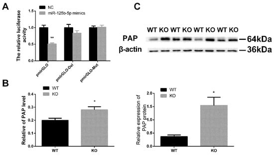A flanking sequence analysis showed that the 3′-UTR of PAP mRNA contains a binding site that perfectly matched the seed region of miR-125b-5p. To verify that PAP was the target of miR-125b-5p, Chinese hamster ovary (CHO) cells were co-transfected with miR-125b-5p mimics/NC and pmirGLO-PAP, pmirGLO-PAP-Mut, and pmirGLO-PAP-Del. Forty-eight hours after transfection, the luciferase activity was assayed. The pmirGLO group showed the lowest luciferase activity when compared with the other groups (p = 0.00002). The reduction was rescued in the mutation group and deletion group (Figure 4A). The result of the luciferase activity showed that PAP was preliminarily the target gene of miR-125b-5p. To further validate whether miR-125b-5p was targeted on the PAP, we examined the expression level of PAP in the testicular tissue both of the KO and the WT. As expected, the qRT-PCR and Western blotting analysis showed that miR-125b-5p KO exhibited higher PAP mRNA expression (p = 0.029) and PAP protein expression (p = 0.023) than the WT (Figure 4B,C). These results collectively demonstrated that PAP was the target of miR-125b-5p.