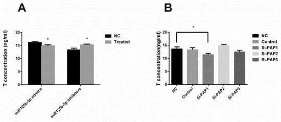 MiR-125b-5p and PAP affected TM3 cell secreted testosterone. (A) TM3 cells were transfected with miR-125b-5p mimics/NC/inhibitor/iNC. (B) TM3 cells were transfected with different kinds of PAP siRNAs. The T (testosterone) concentration of the cell supernatants were determined (n = 6). All of the data are expressed as mean ± SEM. * p < 0.05.