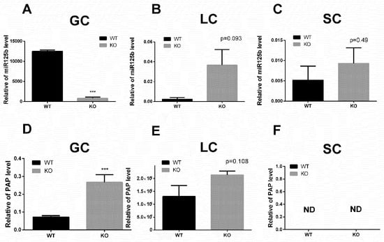 To further validate the relationship between miR-125b and PAP, we isolated three types of testicular cells from the WT and KO mice. After purification of the isolated cells, we examined the expressions of PAP and miR-125b. The RT-PCR results showed that the miR-125b remarkably decreased in the germ cells (GC) (p = 0.0002), but showed no significant differences in Leydig cells (LC) (p = 0.093) and Sertoli cells (SC) (p = 0.49) (Figure 6A–C). Interestingly, we found that the PAP mainly expressed in GC, rarely expressed in LC, and could not be detected in SC (Figure 6F). Meanwhile, the results illustrated that the mRNA level of PAP remarkably increased in GC (p = 0.001) (Figure 6D), but there was no significant difference in LC (p = 0.108) (Figure 6E).