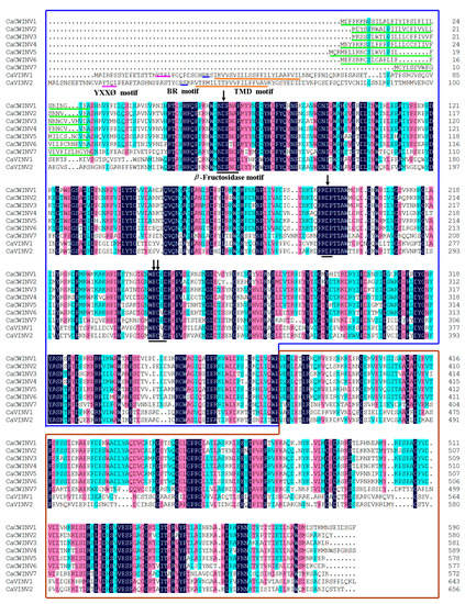Alignment of deduced amino acid sequences of the nine pepper acid invertases. Dark-blue shading, pink shading, and light blue shading reflect 100%, 75%, and 50% amino acid residues conservation, respectively. Catalytic residues are depicted by black arrows. Green lines indicate the predicted signal peptide. Black lines indicate the conserved motif-NDPNG (β-fructosidase motif), RDP and WECP(V)D. Brown lines indicate the predicted transmembrane domain (TMD). The blue lines indicate basic region (BR) motif. The pink lines indicate YXXØ motif.