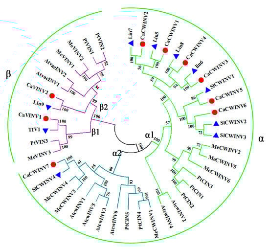 For phylogenetic analysis, the nine full-length CaAINVs identified in this study, as well as ten from tomato, eight from Arabidopsis, nine from cassava, and eight from poplar, were used. These proteins were classified into two major groups, α and β, based on the phylogenetic tree (Figure 2). Seven proteins containing a putative signal peptide, CaAINV1, 2, 3, 4, 5, 6 and 7, were clustered together in the α group. Proteins containing a complex N-terminal propeptide (NTPP) region, CaVINV1 and 2 were clustered in the second major group, termed the β group. In the α group, CaCWINV1, 2, 3, 4, 5, and 6 had a close relationship with Lin5, 6, 7, 8 and SlCWINV1, 2, 3, where these genes were categorized as the α1 group. CaCWINV7 and SlCWINV4 formed a clade and were grouped as the α2 group. In the β group, CaVINV1 had a close relationship with TIV1, and these were categorized as the β1 group. CaVINV2 and Lin9 had a close relationship and were grouped as β2. All CaAINV proteins have a close relationship with AINV proteins from tomato (Figure 2). The two species belong to Solanaceae Juss.
