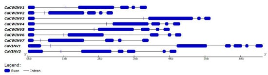 Exon–intron structure of the seven CaAINVs in pepper. Introns are depicted by black lines, exons are depicted by blue boxes.