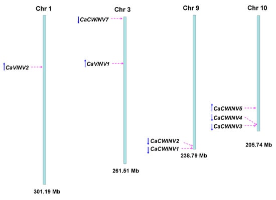 The chromosomal distribution of pepper CaAINV genes was analyzed in order to gain an insight into their evolution. Results mapped the nine CaAINV genes to four chromosomes of the pepper genome (Figure 4). Tandem duplication events were detected in CaCWINV genes. Gene pairs of CaCWINV1/2 and CaCWINV3/4 had similar orientation and tandem duplications on chromosomes 1 and 10, respectively. CaVINV1 was present on chromosome 1, while CaVINV2 was mapped to chromosome 3 with similar orientation.