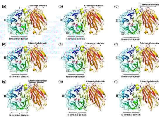 Predicted three-dimensional structure models of CaAINVs. (a) CaCWINV1; (b) CaCWINV2; (c) CaCWINV3; (d) CaCWINV4; (e) CaCWINV5; (f) CaCWINV6; (g) CaCWINV7; (h) CaVINV1; (i) CaVINV2. The five blades of the β-propeller module are indicated by roman numerals I–V, respectively. The motifs (NDPNG, RDP, and WECP(V)D) are depicted by sticks. The image was generated using the PyMOL program (Schrödinger, Inc., New York, NY, USA).