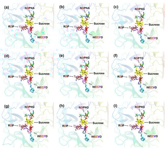 Predicted catalytic residues of CaAINV1 to 6 with sucrose molecules. (a) CaCWINV1; (b) CaCWINV2; (c) CaCWINV3; (d) CaCWINV4; (e) CaCWINV5; (f) CaCWINV6; (g) CaCWINV7; (h) CaVINV1; (i) CaVINV2. Yellow stick structures indicate sucrose molecules. The motifs (NDPNG, RDP, and WECP(V)D) are depicted by colored sticks. Red stick structures depict catalytic residues. The image was generated using the PyMOL program (Schrödinger, Inc., New York, NY, USA).