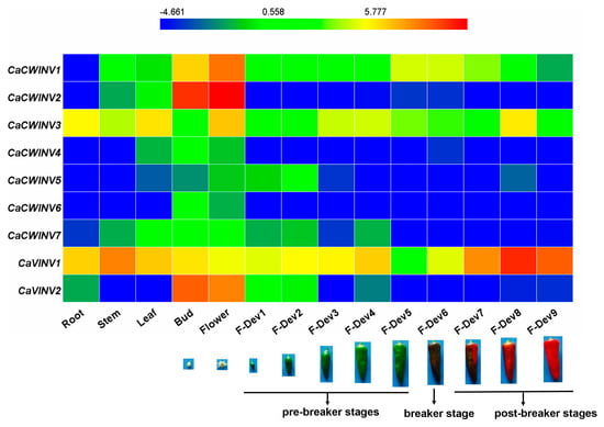 In order to explore the expression patterns of CaAINV genes in pepper, RNA-sequence data from different tissues and developmental stages, such as root, stem, leaf, buds, flower, and nine stages of developing fruits, of pepper cultivar Zunla-1 [12] were used for the analysis (Figure 8). For cell wall invertase genes, CaCWINV3, which was expressed in all test tissues, was the highest expressed gene in the roots, stems, and leaves. CaCWINV2 was the highest expressed gene in buds and flowers. CaCWINV5 was mainly expressed in the F-Dev2 stage of fruits, while CaCWINV4 and 6 was mainly expressed in buds. CaCWINV1, which was expressed in most test tissues, except roots, was the highest expressed gene in flowers. Of the vacuolar invertases, CaVINV1 was expressed in all test tissues and highly expressed in mature fruits, while CaVINV2 was mainly expressed in buds and flowers. During pepper fruit development, CaCWINV1, CaCWINV3, and CaVINV1 were expressed in all stages. CaCWINV1 was mainly expressed at the late pre-breaker stage (F-Dev5) and breaker stage, while CaCWINV3 was mainly expressed at the post-breaker stage of F-Dev8. CaVINV2 expression gradually increased during the pre-breaker stages of F-Dev1 to F-Dev4 and decreased at F-Dev5, followed by an increase at the breaker stages, and a dramatic increase at the post-breaker stages.