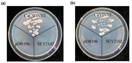 Growth of invertase-deficient strain SEY2102 transformed by pDR196-CaCWINV2 (a) and pDR196-CaVINV1 (b) on selective plates containing sucrose as the sole carbon source at 28 °C for 4 days. SEY2102 yeast cells transformed with empty pDR196 vector were used as control.