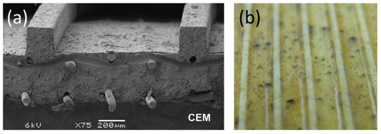 Profiled membranes with straight ridges parallel to the flow direction: (a) SEM-image of a cross-section of the profiled cation-exchange membrane (CEM). Reproduced with permission from Reference [19]. Copyright 2011 Elsevier; (b) Photo of 1 × 1 cm2 section of profiled CEM after more than 60 days of reverse electrodialysis (RED) stack operation, in which air sparging was applied as an antifouling strategy. Reproduced with permission from Reference [21]. Copyright 2016 American Chemical Society.