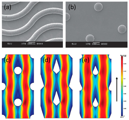 Surface morphology of tailor-made profiled membranes with: (a) waves and (b) pillars corrugations. Reproduced with permission from Reference [22]. Copyright 2014 Elsevier.; velocity fields, obtained by computational fluid dynamics (CFD), around pillar structures with (c) round, (d) diamond, and (e) tear shape, for a flow direction indicated by the upward arrow on the right. Reproduced with permission from Reference [25]. Copyright 2010 Elsevier.