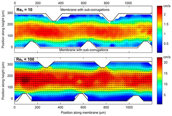 Velocity fields, obtained by particle tracking velocimetry (PTV), of fluid flow between sub-corrugated membranes for Reynold numbers (based on half the channel height), Reh of 10 and 100 in a RED application. Reproduced with permission from Reference [36]. Copyright 2014 Elsevier.