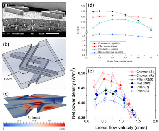 Chevron profiled membranes used in RED: (a) SEM image of the surface morphology, (b) segment of a channel formed by chevron profiled membranes; (c) map of mass transfer coefficient, obtained by CFD, at two linear flow velocity of 1.0 cm/s, (d) comparison, based on CFD simulations, of the ratio (θ) between net power density obtainable in RED stacks with different configurations and the one obtainable in RED stack with empty channels, (e) experimental net power density obtained in RED stacks with different configurations. Reproduced with permission from References [45,46]. Copyright 2016 and 2017, respectively, Elsevier.