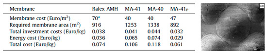 Economic evaluation of an ammonium nitrate treatment process using different anion-exchange membranes (AEM), in which Ralex AMH, MA-41 and MA-40 are flat, MA-41p is a profiled (subscript “p”) version of MA-41, which surface denoted by (a) is shown on the right with a scale bar of 100 μm. aPrices are given for the year 2011. (Reproduced with permission from Reference [49]. Copyright 2016 Elsevier).