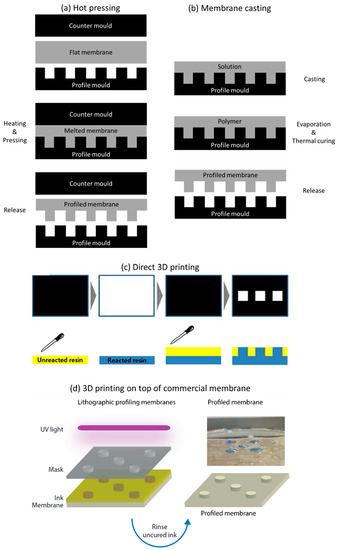 Profiled ion exchange membranes can be prepared by three main approaches: hot (thermal) pressing (Figure 7a), membrane casting (Figure 7b), and 3D printing (photopolymerization) (Figure 7c,d).
