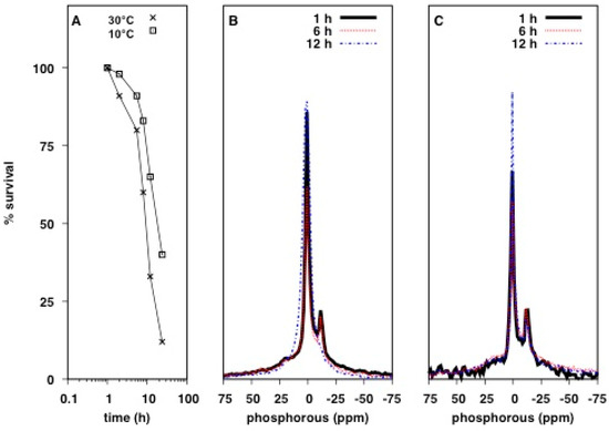 Phosphorous containing molecules provide useful markers for understanding how AMPs interact with bacteria as many biomolecules contain phosphorus, particularly, phospholipids and DNA. Utilizing 31P solid-state NMR, we investigated the effect of antimicrobial agents on live E. coli. Given the use of small NMR rotors holding less than 100 µL of sample, hydration, oxygen availability and nutrient supply could severely limit the sample integrity and, therefore, data quality over the course of an experiment. To determine the length of time in which live cell samples are sufficiently stable for NMR analysis, we assessed bacterial survival at different time points during an NMR experiment at 30 and 10 °C under static condition, i.e., without magic angle spinning (MAS). Samples were prepared by growing bacteria to an OD600 of 0.5, media components were removed by washing in isosmotic salt buffer prior to packing the cell slurry into a 4 mm zirconia MAS rotor and immediately acquiring NMR spectra. Cell survival was quantified by the number of colony forming units (CFUs) in an aliquot of cells taken from the rotor at various time points. Bacterial viability was remarkably stable over a 4 h period given the high cell density (>1010 CFU/mL). After 12 h the number of CFU decreased by 70% at 30 °C while cell survival was greatly improved by maintaining the sample at 10 °C, in which CFU declined by only 33% over the same period (Figure 1A). 31P static spectra collected at 10 and 30 °C showed a superposition of lineshapes, indicative of a wide range of 31P environments (Figure 1B,C). After 12 h at 30 °C there was a significant reduction in spectral quality, concomitantly with reduced cell survival (Figure 1A,B). Most notably the intensity of the peak at −11 ppm disappeared and most features merged into a broad isotropic signal, indicative of fast molecular reorientation on the 31P NMR time scale, suggesting a significant loss of cellular integrity and hence sample degradation. However at 10 °C, no drastic change was observed, even after 12 h, and so subsequent experiments were performed for up to 6 h at 10 °C.