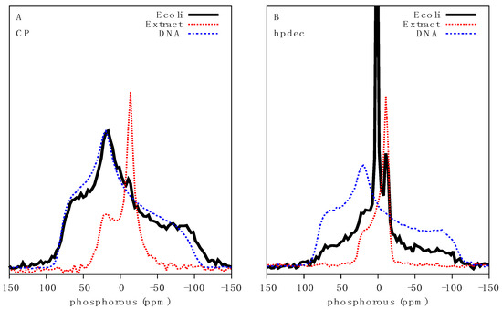 Characterization of bacterial DNA by 31P solid-state NMR: (A) 31P CP spectra using a contact time of 1.5 ms; and (B) Direct 31P excitation spectra of E. coli (black solid line), MLVs made of E. coli total lipid extract (red dotted line) and dry genomic DNA (blue dash-dotted line). All spectra were acquired at 10 °C.