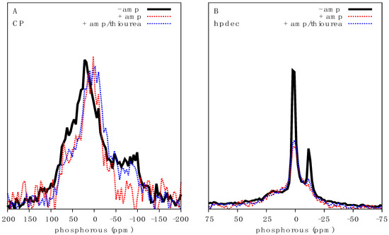 Characterization of the effect of ampicillin on E. coli: Bacteria grown to OD600 = 0.5 were treated with 20 µg/mL ampicillin for 1 h prior to NMR analysis. (A) 31P CP spectra at 1.5 ms contact time, and (B) 31P direct excitation spectra of E. coli (black solid line), ampicillin treated E. coli (red dotted line) and ampicillin and thiourea treated E. coli (blue dotteded line). Spectra have been scaled to facilitate lineshape comparisons.