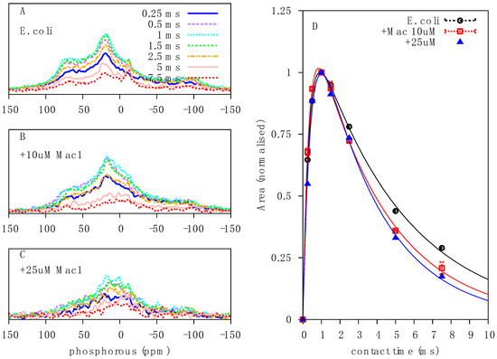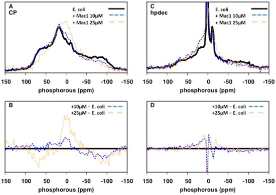 We next assessed the impact of the AMP, Mac1.1 on E. coli by 31P solid-state NMR. E. coli cultures were treated with sub-MIC concentrations of Mac1.1 (MIC of order 100 µg/mL or greater against E. coli, [12]) for 30 min prior to NMR analysis. At 10 µM Mac1.1, a loss of signal intensity at the edges of the 31P CP spectrum was observed (Figure 4A,B). Increasing the amount of Mac1.1 to 25 µM intensified the lineshape alterations. The results indicate a change in NA dynamics with an increase in the proportion of molecules undergoing fast reorientation as observed following ampicillin treatment. Direct excitation 31P spectra showed a similar increase in fast-reorienting 31P molecules significantly reducing the signal intensity of axially reorienting lipids, indicative of membrane disruption (Figure 4C,D).