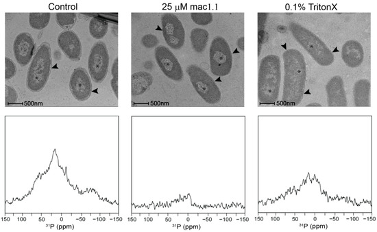 DNA morphology modulation and intermembrane collapse induced by Mac1.1: Upper panels show electron micrographs of E. coli (left panel), Mac1.1 treated (middle panel) and 0.1% triton-X treated (right panel). Asterisks indicates genomic DNA, arrow heads indicate the periplasmic space. E. coli were prepared as previously described for NMR experiments but washed in phosphate buffered saline (PBS) prior to preparation for transmission electron microscopy. Lower panel shows the comparable 31P CP NMR spectra performed at 30 °C.