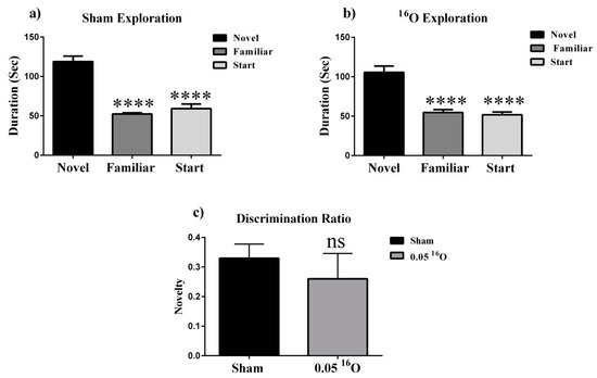 We used the Y-maze to determine if low-dose 16O radiation affected short-term spatial memory [23]. The amount of time a mouse spends exploring the novel arm of the maze compared to the familiar arm in the testing phase is indicative of its ability to retain the spatial memory encoded during the familiarization session. We observed that all irradiated groups displayed significant differences in exploration between the maze arms during the testing phase (0 Gy: F(2,25) = 42.49, p < 0.0001, Figure 1a; 0.05 Gy: F(2,26) = 29.54, p < 0.0001, Figure 1b). We then calculated the discrimination ratios for the Y-maze to help characterize each animal’s ability to remember a novel arm or object. All cohorts showed positive discrimination ratios, and there was no effect of radiation on discrimination ratios (t = 0.6801, p = 0.51; Figure 1c).