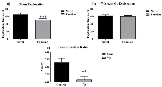 Novel object recognition. (a) sham-irradiated animals spent significantly more time exploring the novel object. (b) Irradiated groups were unable to discern the novel from the familiar object on test day, whereas (c) radiation induced decreased discrimination ratios, representing an inability to discriminate between the novel and familiar objects. Average ± SEM (n = 12); ** p < 0.01, *** p < 0.001.