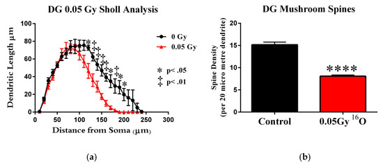 Dentate gyrus granule neurons. We performed Sholl analyses to investigate the effects of 16O on dendritic length (assaying the distance from the soma in 10-µm intervals). We detected significant interactions between treatment and dendritic length (F(23,184) = 2.78; p < 0.0001), indicating that the effect of radiation was associated with a different distribution of dendritic branches over the entire tree. We also found significant main effects on Sholl dendritic length after 0.05 Gy irradiation (F(23,184) = 50.00; p < 0.0001) and treatment (F(1,8) = 35.77; p < 0.001). Post-hoc analysis revealed that irradiation decreased dendritic arborization compared to the sham controls. We observed significant decreases in the dendritic arbor at a distance of 120–190 µm from the soma after 0.05 Gy (Holm-Sidak 120–140 µm, p < 0.05; 150–190 µm, p < 0.01; Figure 3a). In addition, we observed significant decreases in the number of branch points (t = 3.20, p < 0.05), dendritic length (t = 4.84, p < 0.01), tips (t = 2.83, p < 0.05; Table 1), and dendritic complexity (t = 3.81, p < 0.01; Table 1) in irradiated animals compared to controls. These data indicate that 16O irradiation decreased dendritic complexity in the DG region of the hippocampus.