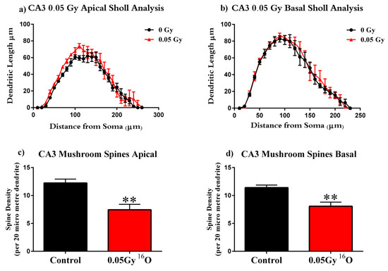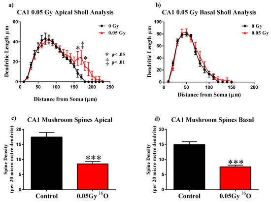 Cornu Ammonis 1 (CA)1 pyramidal neurons. Next, we analyzed differences in the CA1 neurons between groups. We found significant interactions between treatment and dendritic Sholl length in the apical subregion (0.05 Gy: F(22,176) = 2.144; p < 0.05). However, we did not see significant interactions between treatment groups and dendritic Sholl length in the basal subregion. We also found significant main effects on Sholl dendritic length after 0.05 Gy radiation in the apical (F(22,176) = 45.97; p < 0.0001) and basal (F(14,112) = 110.1; p < 0.0001) subregions. Post-hoc multiple comparisons revealed significant increases in dendritic length after 0.05 Gy irradiation at 160–180 µm (Holm-Sidak 160 and 180 µm, p < 0.05; 170 µm, p < 0.01; Figure 4a) from the soma in the apical CA1. However, we saw no significant increases in dendritic length in the basal CA1 (Figure 4b).