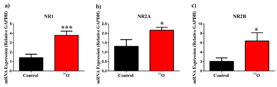 Alterations in N-methyl-d-aspartate (NMDA) mRNA expression. 16O significantly up-regulates expression of (a–c) NMDA receptor subunits NR1, NR2A and NR2B. Average ± SEM (n = 10)); * p < 0.05, *** p < 0.001.