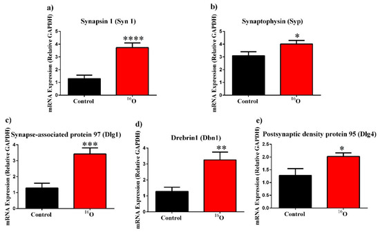 We analyzed the mRNA expression of presynaptic markers of synapsin-1 (t = 4.30, p = 0.0001; Figure 7a) and Synaptophysin (t = 2.50, p = 0.03: Figure 7b) underwent a significant increase in expression. Radiation exposure to postsynaptic markers Synapse-Associated Protein 97 (t = 4.34, p = 0.0005: Figure 7c), Drebrin 1 (t = 3.24, p = 0.003: Figure 7d) and Postsynaptic density protein 95 (t = 2.54, p = 0.02: Figure 7e) also resulted in significant increases in mRNA expression.