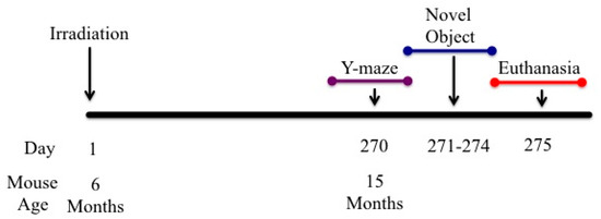 Animal behavior was tested 9 months after irradiation (n = 12 per treatment) (Scheme 1). Mice were first tested in the Y-maze, which does not rely on either negative or positive reinforcement. The maze is constructed out of acrylic and consists of 3 similar arms (45 L × 7 W × 14 H cm): a “start” arm where animals are placed initially, a “familiar” arm, and a “novel” arm. The familiar and novel arms each contained an object of different size and shape mounted at the end of the arm. Animals were placed in the start arm facing away from the center of the maze. The familiarization session consisted of free exploration of the start and familiar arms for 10 min. Four hours later, the testing session was held; animals were again placed in the maze, this time with access to all arms. Allocation of arms (start, familiar, or novel) was counterbalanced between each experimental group. Trials lasted for 10 min, and center and nose-points were recorded throughout each session. All experimental arenas were wiped clean with 20% ethanol after each trial. All behavioral experiments were conducted during the light cycle under dimly-lit (white light) conditions, after a minimum of one hour of acclimation. Behavioral experiments were recorded on a charge-coupled device video camera, located above the maze for automatic behavioral analysis with EthoVision® software version 11 (Noldus Information Technology, Leesburg, VA, USA).