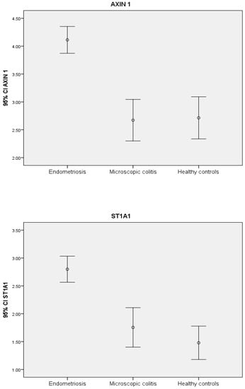 There are several limitations of this study. The study is of a cross-sectional design and cannot investigate causal relationships. Another disadvantage is that patients with MC and healthy controls differed significantly in age compared to women with endometriosis. To minimize this impact, all comparisons between groups were adjusted for age. However, the fact that some of the women with MC were menopausal may affect the differences in protein levels. We could not find any studies regarding the impact of menopause on the proteins that differed the most. Generally, several cytokines are elevated in postmenopausal women, e.g., IL-1β, IL-6, and IL-8, which is why the actual estimated differences may be underestimated [20,33,34]. The phase of the menstrual cycle was neither known in controls nor in endometriosis, but the majority of endometriosis patients were on continuous hormonal treatment affecting the cycle. Continuous combined oral contraceptives have been shown to significantly reduce pelvic pain and improve quality of life in endometriosis [35,36]. Hormonal treatment may also affect protein levels. Oral hormonal therapy with estrogen, with or without progestogens, has been shown to increase the blood levels of CRP and to reduce other inflammatory factors such as MCP-1 and TNF-α [37]. Current hormonal treatment was not known in controls, which is a limitation. Although no studies have examined the effect of the menstrual phase on AXIN1, ST1A1, and CXCL9 levels, this should be examined in future studies, to exclude impact. However, these proteins that showed the greatest differences between endometriosis and controls were not affected by hormonal treatment in endometriosis, which suggests that hormone levels, either dependent on treatment or menstrual phases, are of minor importance to their serum levels. Protein levels in PEA are expressed as arbitrary units, and cannot be compared to other protein levels. MC is sometimes treated with immunosuppressive medication, most often budesonide which is inactivated by first-passage metabolism in the liver, and does not exert systemic effects with altered levels of inflammatory proteins. However, the vast majority of included patients were in an inactive state of the disease and had no treatment. Furthermore, protein levels did not differ between MC and healthy controls who had no immunosuppressive treatment. The low number of healthy controls may explain the fewer significant differences between endometriosis and controls than between endometriosis and MC.