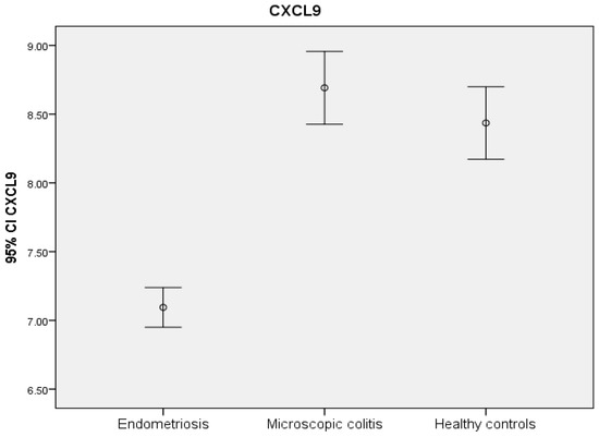 C-X-C motif chemokine 9 (CXCL9) was the protein with the most significant decrease compared to both MC and healthy controls (p < 0.001) (Table 2) (Figure 1).
