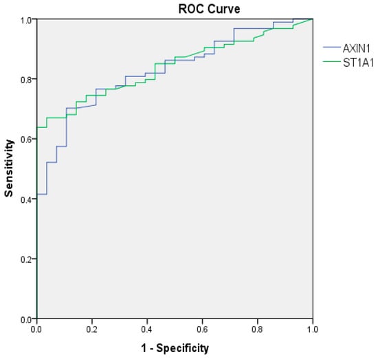 AXIN1 and sulfotransferase 1A1 (ST1A1) were the two most significantly elevated proteins in endometriosis compared to MC and controls (Table 2) (Figure 1). Receiver operating characteristic (ROC) curves showed high area under the curves (AUCs) for these proteins, 0.830 and 0.839, respectively, indicating high sensitivity and specificity for endometriosis (p < 0.001) (Figure 2).