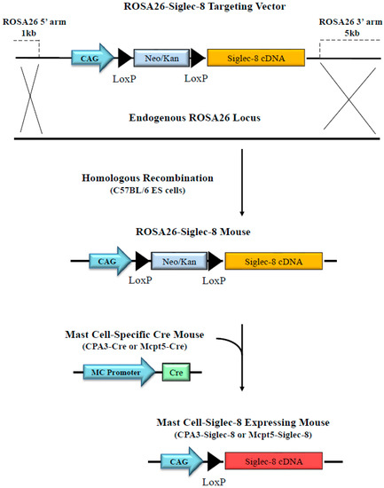 Mast cells play important roles in allergic diseases and asthma, and mast cell abnormalities in number and function underlie disorders such as mastocytosis, urticaria and the mast cell activation syndrome [14,15,16]. Siglec-8 expression was found on human mast cells from several organs and some mast cell lines [10,17,18]. To date, all studies on Siglec-8 have been carried out using human tissues, cells, and cell lines in vitro, in large part because Siglec-8 is not expressed in lower species other than some non-human primates [18]. Recently, our group generated a new mouse strain in which Siglec-8 expression was specifically targeted into eosinophils [19]. This will allow further studies of Siglec-8 in eosinophils in vivo, particularly in the context of disease models and therapeutic potentials. However, animal models in which Siglec-8 is specifically expressed on mast cells are still not available. In this work, using the Cre-LoxP system, we generated two new mouse strains that were engineered to express Siglec-8 selectively on mouse mast cells, and we performed the initial characterization of Siglec-8 surface expression and mRNA levels, consistency of mast cell selectivity of expression, and the impact of its expression on mast cell numbers in tissues.